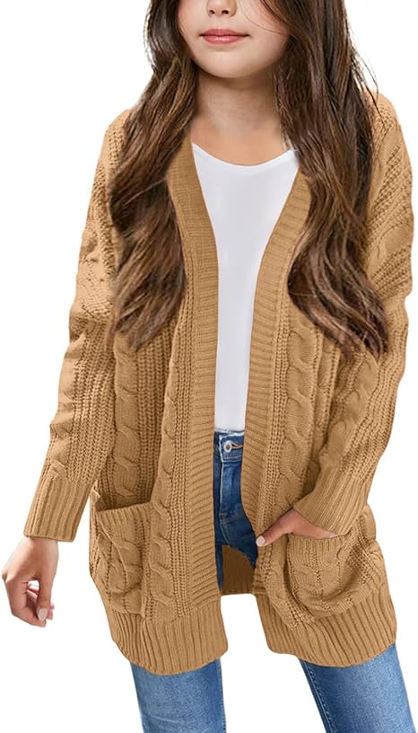 Girls Open Front Cardigan Long Sleeve Casual Kids Fall Clothes Solid Thick Chunky Sweater Coat with Pockets