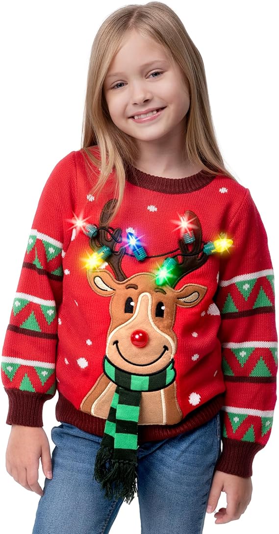 Kid's Christmas Ugly Sweater LED Light Up Reindeer Xmas Sweater Built-in Light Bulbs for Boys Girls