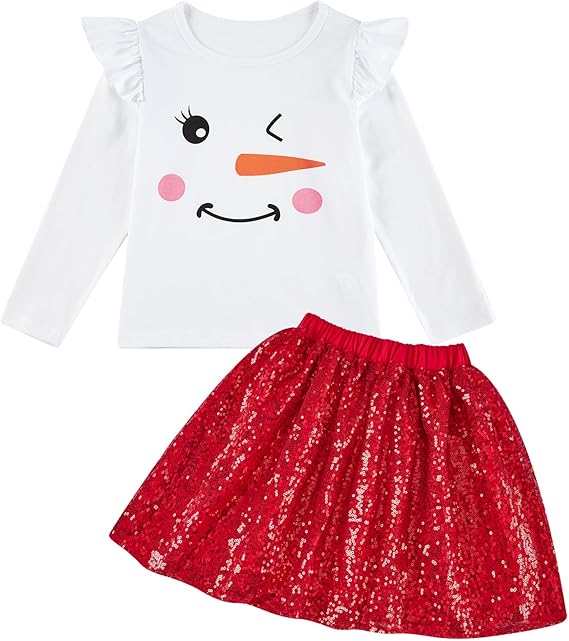 Girls Christmas 2 Piece Outfit Glitter Skirt Sets and Ruffles Long Sleeve Shirts Tops Clothes 2-6 Years