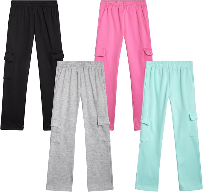 Girls’ Sweatpants – 4 Pack Active Basic Fleece Cargo Jogpants, Joggers or Flares (5-16)